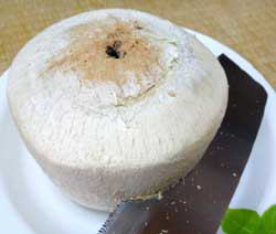 ココナッツの容器に入れたココナッツジュースを売っていますけど、