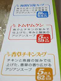 海鮮白湯スープ、トムヤムクン、香草チキンスープの3種類。例によって1種類だけ数が多いです。海鮮白湯スープは10袋。トムヤムクンと香草チキンスープは5袋づつ。