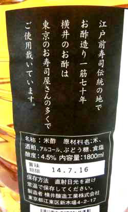 「本格江戸前 米酢」とパッケージにあり(このページの一番上の写真です)。