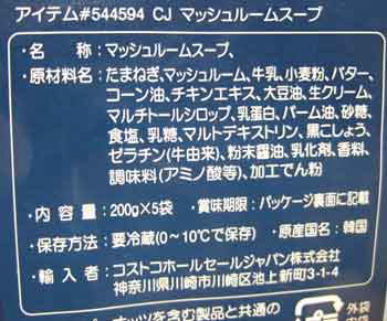韓国産のマッシュルームスープです。コストコ店内の冷蔵食品コーナーで見つけました。買ったのは去年の9月、これを書いているのは2010年4月です。遅っ。