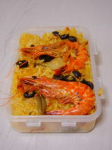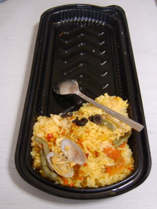 購入日は平日の夜。7時過ぎに来店したのですが、パエリアは出来立て!人だかりが出来ていました。持ってみるとほかほか。思わず購入。