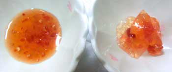 スイートチリソースと比べて頂くと、このレッドチリスプレッドのかたさが分かって頂けるかと。