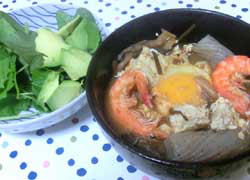 焼き豆腐、ソフトシェルシュリンプ、こんにゃく、卵、ネギ、ショウガを追加。