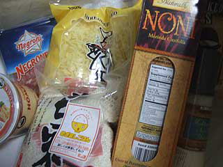ノニジュース、もち米、サラミ、モッツァレラチーズ、ホムス